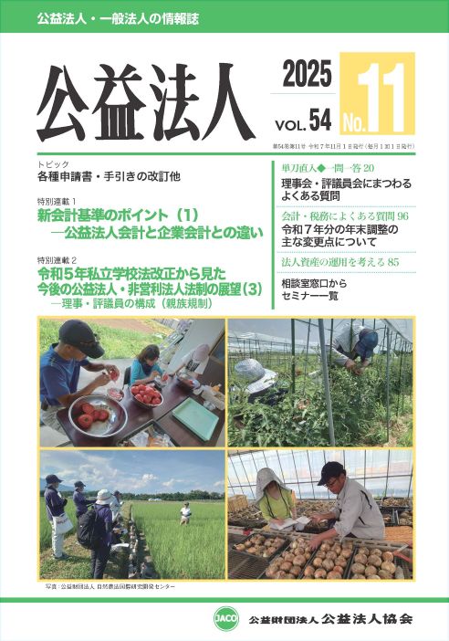 【トピック】各種申請書・手引きの改訂、公益認定法令における「事実上婚姻関係と同様の事情にある者」の扱い、【特別連載1】ようこそ、公益法人の世界へ!―2025年度インターンシップ(松野亜希子)、【特別連載】新会計基準のポイント(1)――公益法人会計と企業会計との違い(金子良太)、【特別連載2】令和5年私立学校法改正から見た今後の公益法人・非営利法人法制の展望(3)理事・評議員の構成(親族規制)(大野憲太郎)、【単刀直入一問一答20】理事会・評議員会にまつわるよくある質問(公益法人協会相談室)、【会計・税務によくある質問96】令和7年分の年末調整の主な変更点について(出塚会計事務所)、【法人資産の運用を考える85】母体企業株式とその(公益)法人の“ 浮沈(梅本洋一)
